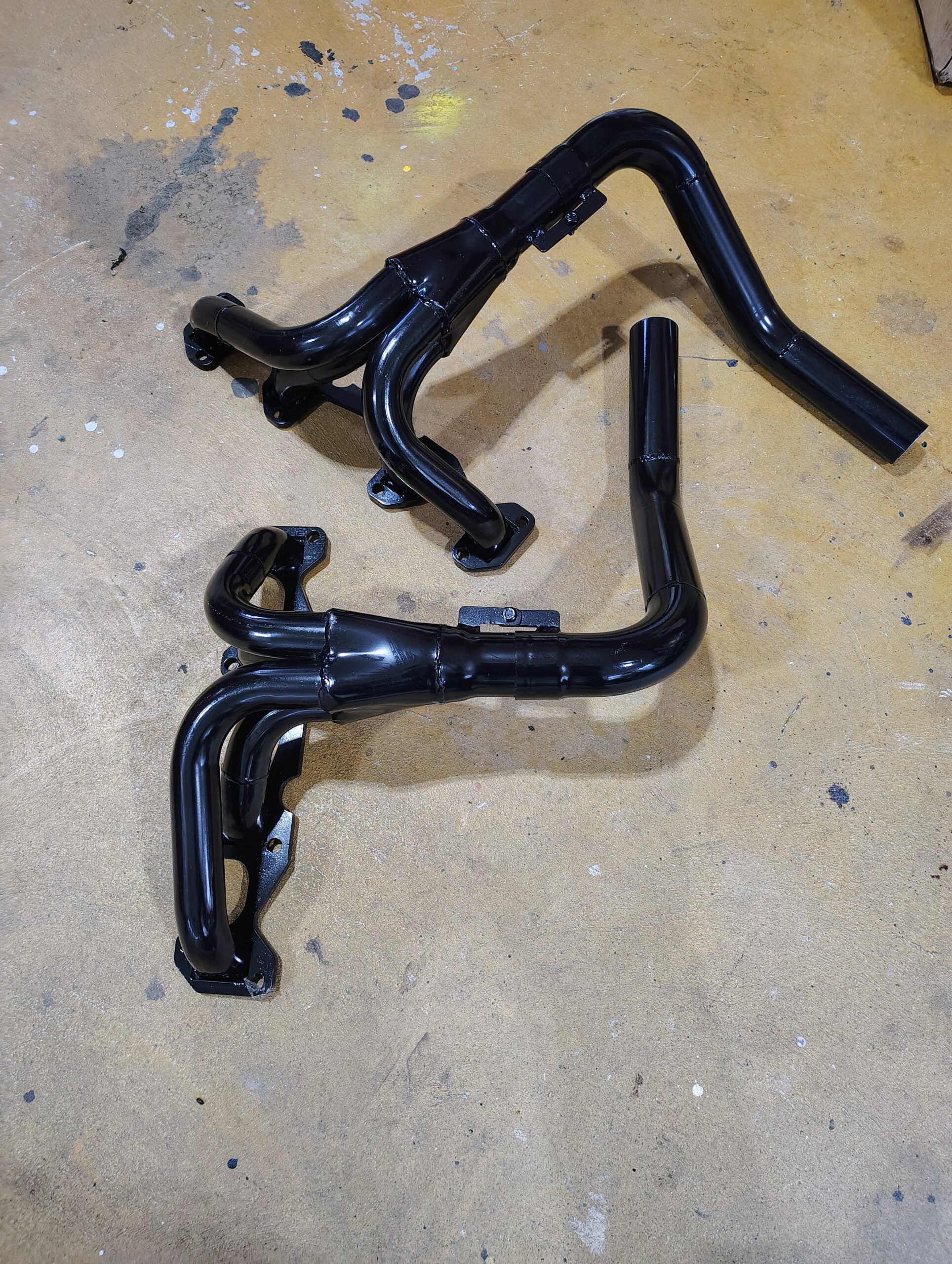 So this time I ordered RV8 headers from TSI. Took almost 2 months to get them but they came in and they look very good. Heavier material than the huggers were. Also all the headers I found available hugger or not were for the Buick not the Olds. The Olds heads have 5 bolts per cylinder the Buick has 4 but more importantly the bolts on the Olds are proud of the exhaust plane while on the Buick they are recessed. I had to grind the stabilizer plate so it would fit. Here’s some pics: